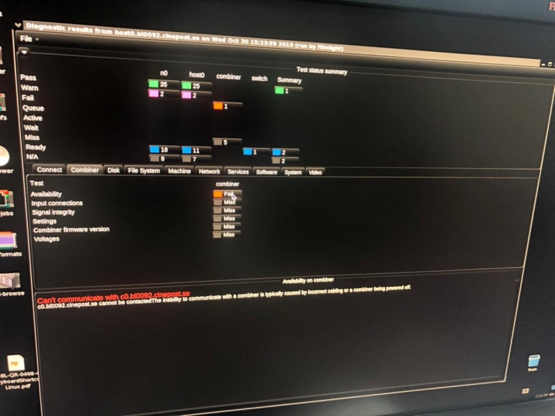 Hello! Please can you help me? I just bought a Baselight 2 with blackboard 1 but no support from but Filmlight. The first day everything everything goes well.On the second day the system turned on but Baselight software did not start. Diacnostic result please see in attach. I used another DVI cable to connect Combiner with Node, not original cable. Is this one problem the dvi cable is dedicated?? Is this due to the fact that the device is not connected to the network? Can it be connected to the network itself, or it will need Filmlight support? Thank you Bledi 34/5000