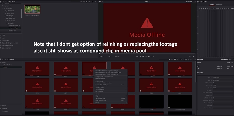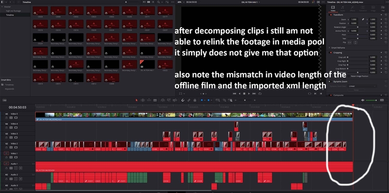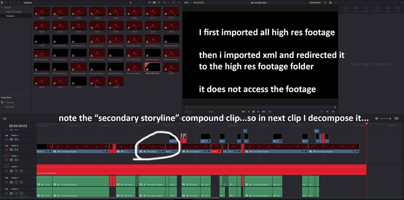 1. Hey guys! How do you tackle the issues faced on importing fcpxml from Final Cut Pro X to Resolve? I have attached the snapshots of the problems that I am facing. Please help me. The ultimate solution is to work on Bake n Blade, but I want to understand how this problem can be solved. I imported all high resolution footage (23.976 fps) in to resolve. the editor edited in 25 fps when I import xml then even if I redirect it to the high res folder, it does not recognise it the imported clips come in as "Secondary storyline" compound clips. So i decompose them. I see they get converted in to clips (which I still do not see in media pool) but Resolve does not give me any option of re-linking or replacing the clips above all, the reference movie given by editor, in 25fps, comes in 6 seconds longer than the xml import Can any one please help me understand how to tackle these xml issues. I recently graded 2 films, one was exported xml from premiere pro and the other from Avid. I did not face any of these issues there. Please advise me on fcp xml. I would really appreciate it. Many thanks in advance